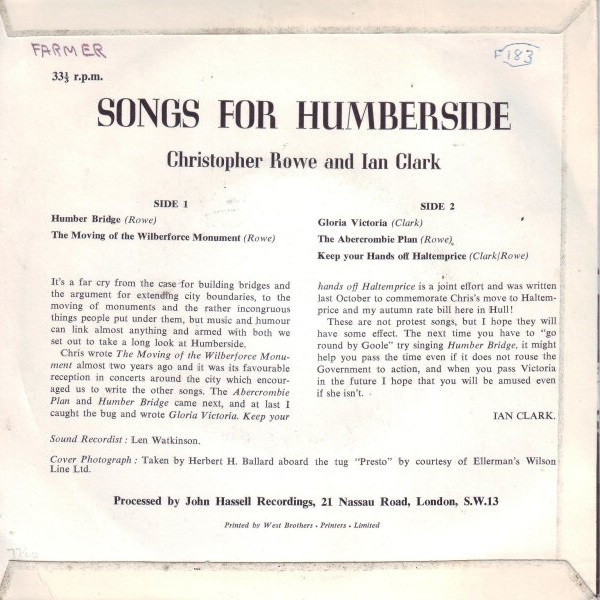 Thank God there are still people who remember Christopher Rowe's and Ian Clark's wonderful songs. They are sure Hull's answer to Flanders and Swann. I got a copy of "Songs for Humberside" so many years ago, and I still enjoy listening to the marvellous stuff. Which betrays my age, I guess…