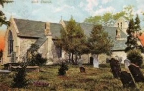 It is an old church restored last century, with black and white roofs looking down on cream walls and arches. The arcades are medieval, and the narrow 13th Century doorway to the vestry has an old studded door and hinges. There are two old carved chairs. The glass showing four choristers is in memory of two of them. A window in a corner of the chancel has a scene which may be unique in a church - Queen Victoria near the close of her long life, visiting the wounded of the South African War. She sits in her wheel chair, giving to one of the soldiers a bunch of the daffodils which one of her ladies (wearing a lovely mantle with a fur collar) holds in her arm. Conducting the royal party is an officer in the brilliant blue uniform of the Guards. It is like a vivid page from a picture book.