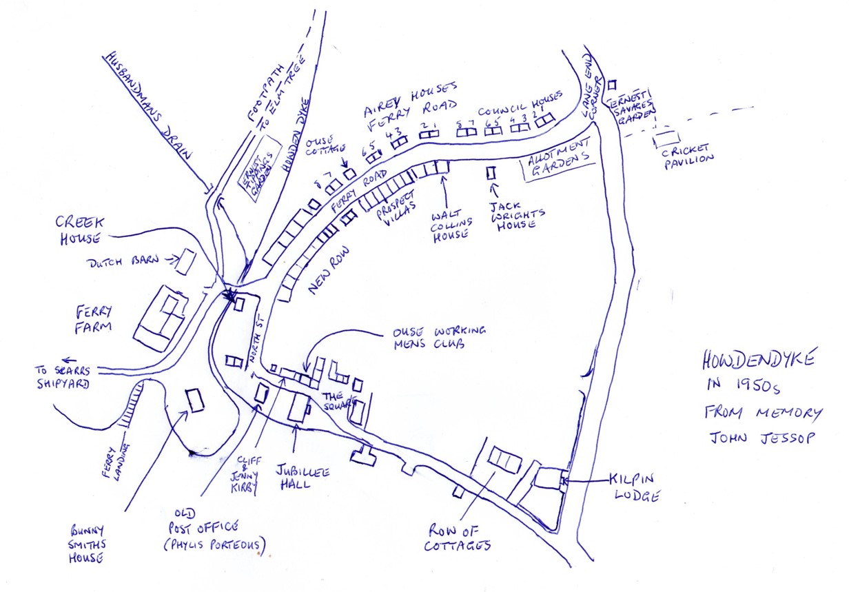 I know most of the village names for the 1950s because I lived at the post office 1943-62 and took the mail round the village from about age eight. I did put some stories in my book but I can see from this website that there are a lot more for someone to put together: homing pigeons; getting stuck in the river mud; climbing the pylon on the Ferry House staithe and being chased down by Harry Smith; Harry opening and closing the clough; threshing at Anson's farm; the two white farmhorses out to grass; playing Howden kids at cricket (they were abusive when they lost so we stampeded the horses to give them a fright); mushrooming in Black Shed field, at the back of Vernie Jessop's greenhouses; frogspawning in that same field; skating on the grips in the back field; swinging from the Bent Tree in that field; going to Sunny Bank (Pollard's Pond) via the Fallen Tree behind the allotments; roaming the fields with Cliff Coulthard of Sunny Bank; characters like Ernest Savage, Tommy Palmer (who told me, when I worked at the shipyard, "I'm akin to thou," and he was), Mary Brammer, and the guy in Prospect Villas who grew tobacco; HBT 90; Bonzo the dog; Holt's last bus from Goole, stopping at Elm Tree; being totally free to run about with other kids of both sexes all day without let or hindrance; trespassing in the Chemics and on the barges at the jetties; Mischievous Night November 4th; Bonfire Night in the Square, November 5th; going birds nesting; watching Bert Tipping climb to the top of enormous trees and dropping crows' eggs down into a loose jacket so they wouldn't break; going for waterhens' eggs with a spoon on the end of a brush handle; etc. The kind of freedom which rarely exists today, with all the fear and Health and Safety.